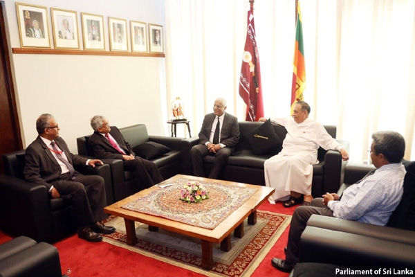 Dr. Indrajith Coomaraswamy the Outgoing Governor of Central Bank of Sri Lanka paid a courtesy call on Speaker Hon. Karu Jayasuriya at the Parliamentary complex recently. Dr. R.H.S. Samarathunga, former Secretary to the Treasury and Mr. Dhammika Dasanayake, the Secretary General of Parliament were also present at the occasion. Later a luncheon was hosted by the Hon. Speaker at his official dining room.