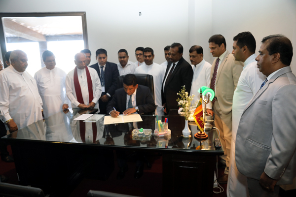 Minister Johnston Fernando after proceeding to the office of the Chief Government Whip was warmly welcomed by the parliamentary staff where he signed documents as the Chief Government Whip assuming his duties.