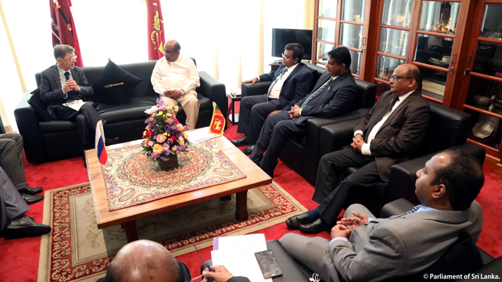 Mr. Yury Materiy, Ambassador of the Russian Federation paid a courtesy visit on the Speaker Hon. Mahinda Yapa Abeywardane today at the Speaker’s VIP room at the Parliament. The State Minister of Urban Development, Coast Conservation, Waste Disposal and Community Cleanliness Dr. Nalaka Godahewa and Secretary General of Parliament Dammika Dassanayke accompanied the Speaker to this meeting.