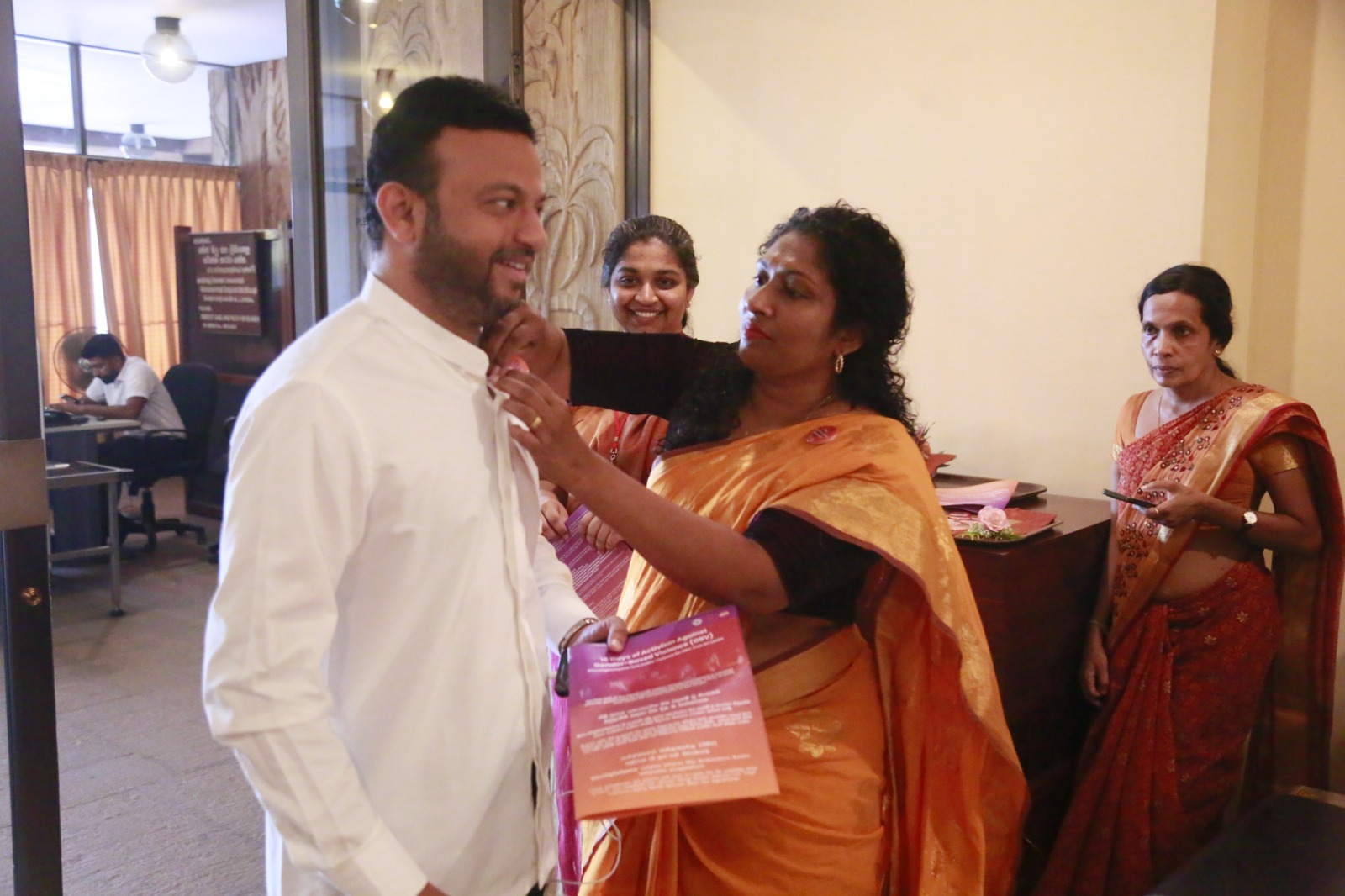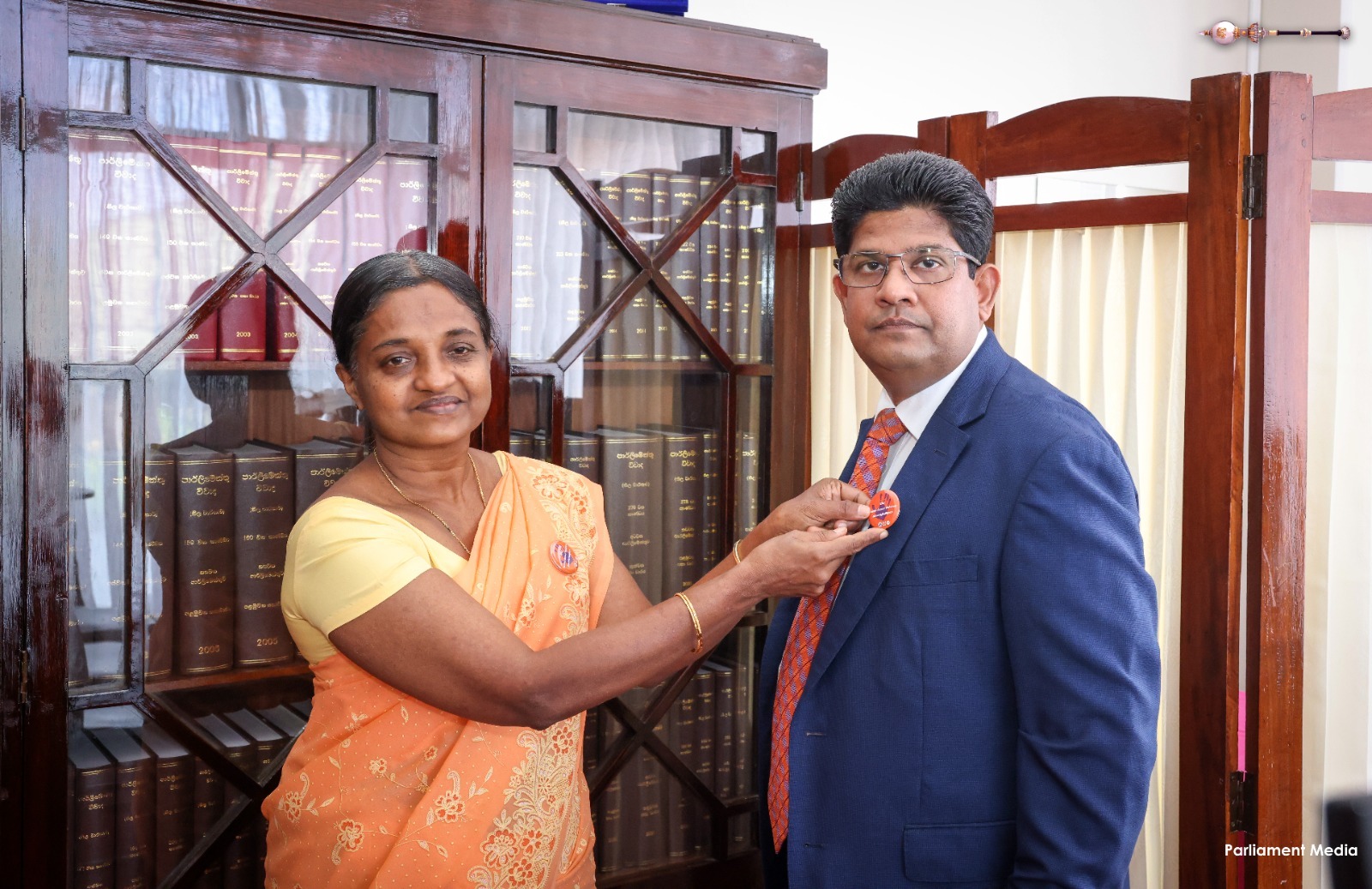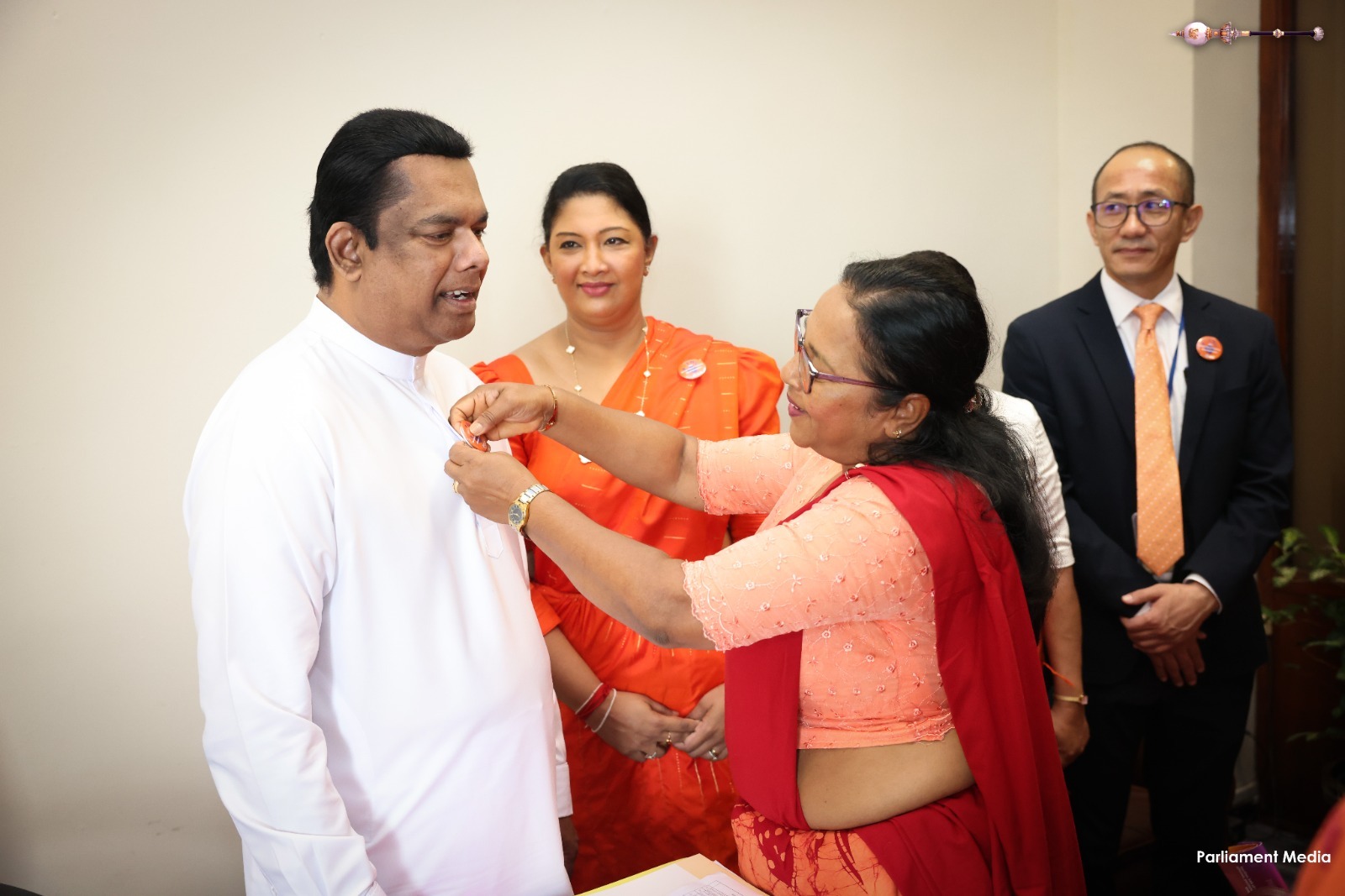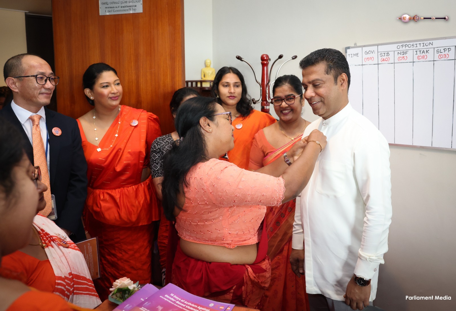 Supporting the “16 Days of Activism” to end gender-based violence, a series of programmes was held today (24) within Parliament. Accordingly, badges symbolizing the commitment to end gender-based violence were pinned onto Hon. Prime Minister Dr. Harini Amarasuriya and Hon. Speaker (Dr.) Jagath Wickramaratne.