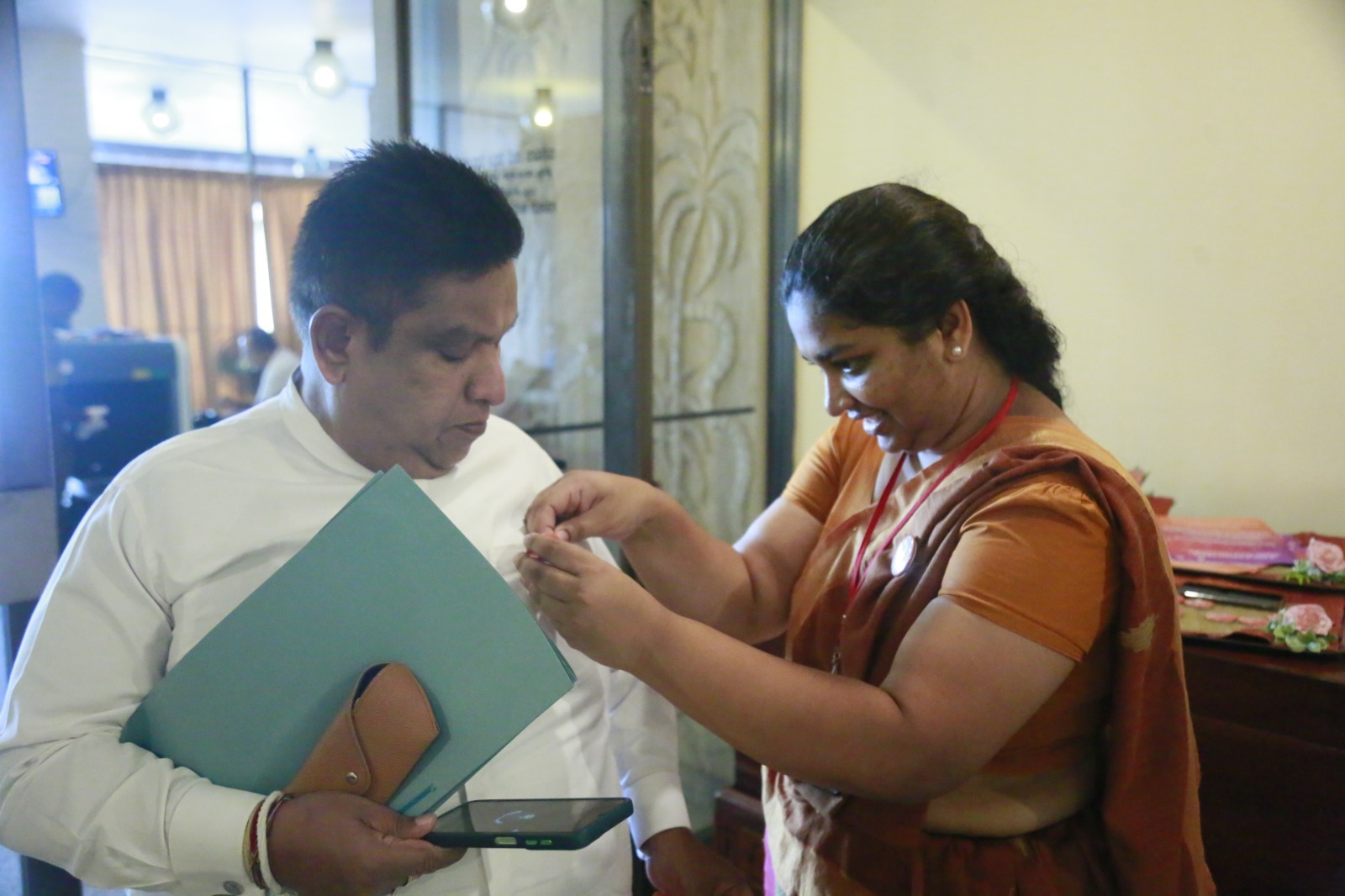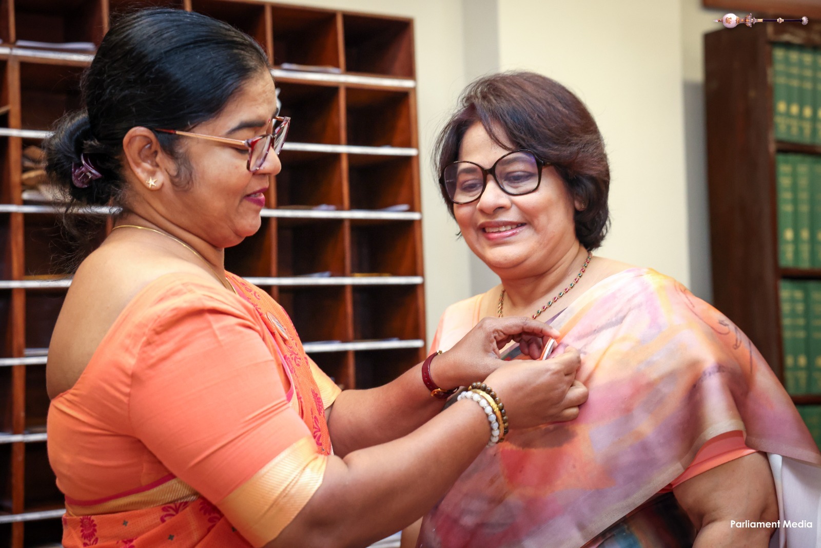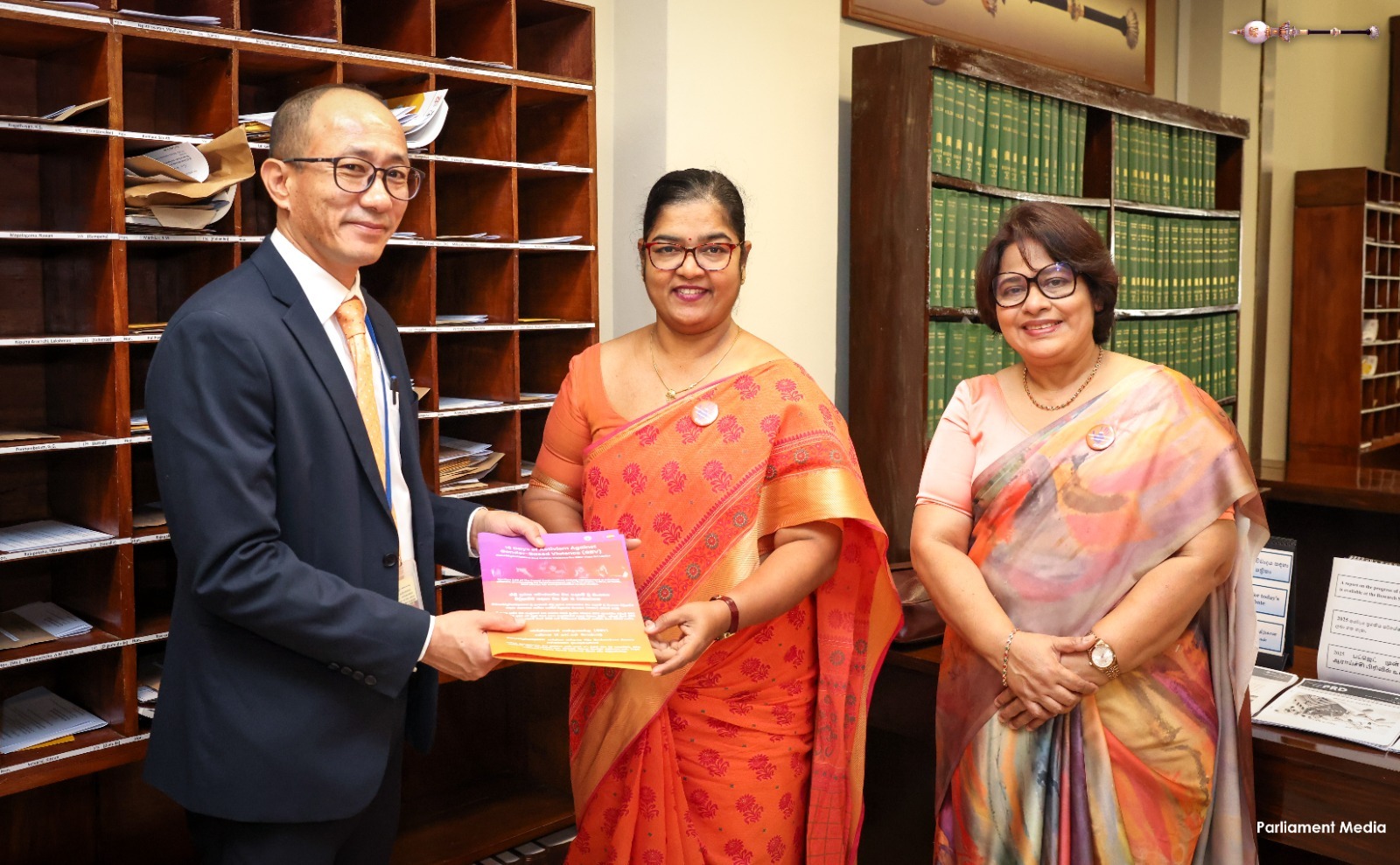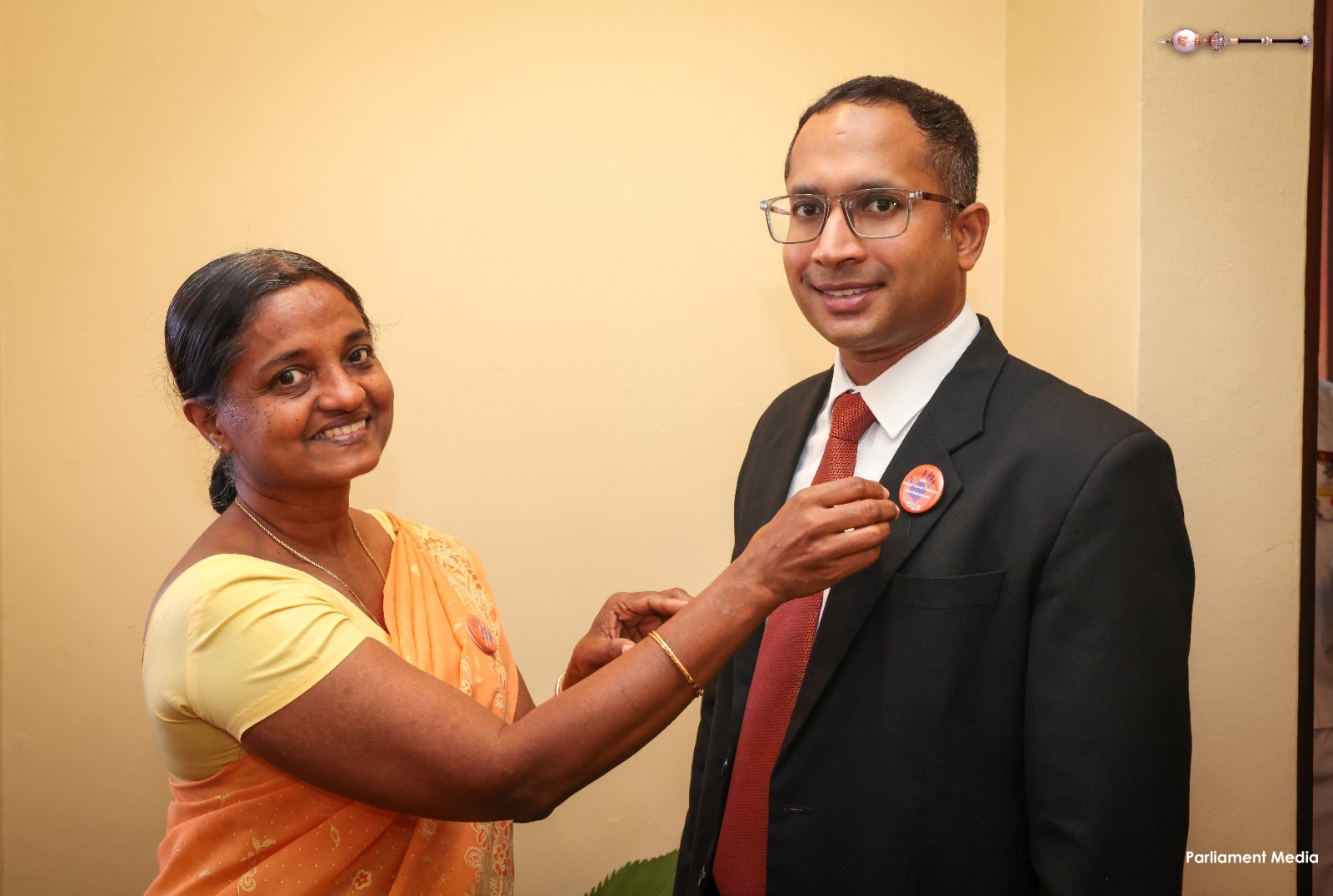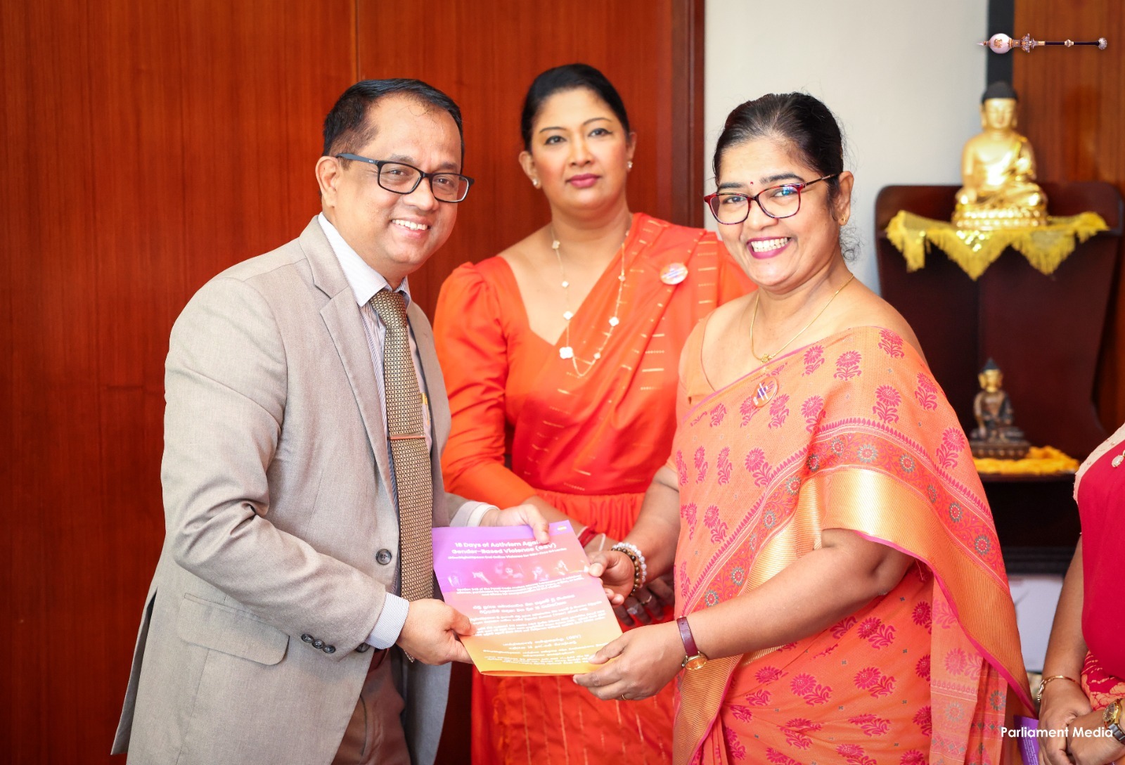 Supporting the “16 Days of Activism” to end gender-based violence, a series of programmes was held today (24) within Parliament. Accordingly, badges symbolizing the commitment to end gender-based violence were pinned onto Hon. Prime Minister Dr. Harini Amarasuriya and Hon. Speaker (Dr.) Jagath Wickramaratne.
