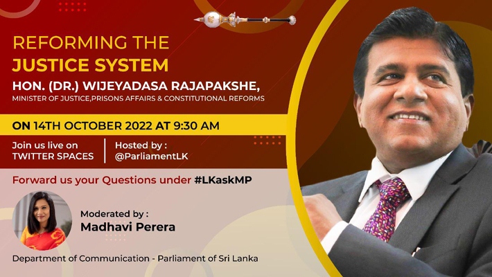 The live Twitter Spaces discussion on “Reforming the Justice System” will be held on the 14th of October from 9.30 am to 10.30 am via the Parliament official Twitter account (@ParliamentLK) with the participation of Hon. (Dr.) Wijeyadasa Rajapakshe, Minister of Justice, Prisons Affairs and Constitutional Reforms.