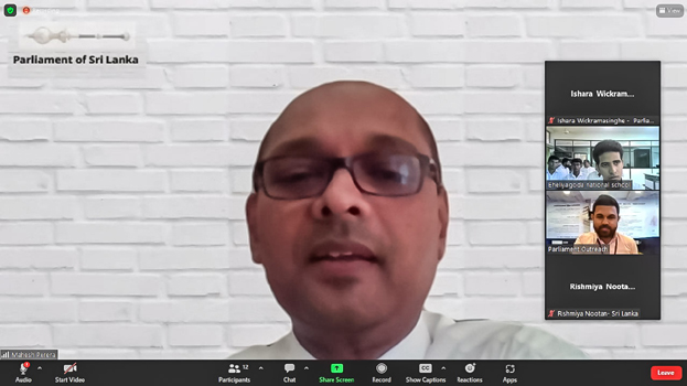 Director (Information System Management) of Parliament Mr. Mahesh Perera and other officers Mr. Narendra Lakmal and Mr. Chaminda Willoraarachchi also participated in this program held online. In addition, the Director (Coordinating Engineer) of the Parliament of Sri Lanka, Mr. Lalith Adhikari, also presented a speech based on his experience on electronic voting in Parliament. Director Legislative Services and Communications, Mr. Janakantha Silva joined the program and congratulated the first Student Parliament meeting to be established at Eheliyagoda National College after the election on behalf of the Parliament.