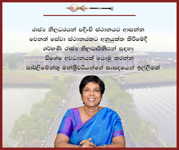 රාජ්ය නිලධරයන් පදිංචි ස්ථානයට ආසන්න වෙනත් සේවා ස්ථානයකට අනුයුක්ත කිරීමේදී ගර්භණී රාජ්ය නිලධාරිනියන් සඳහා විශේෂ අවධානයක් යොමු කරන්න - පාර්ලිමේන්තු මන්ත්රීවරියන්ගේ සංසදයෙන් ඉල්ලීමක් |