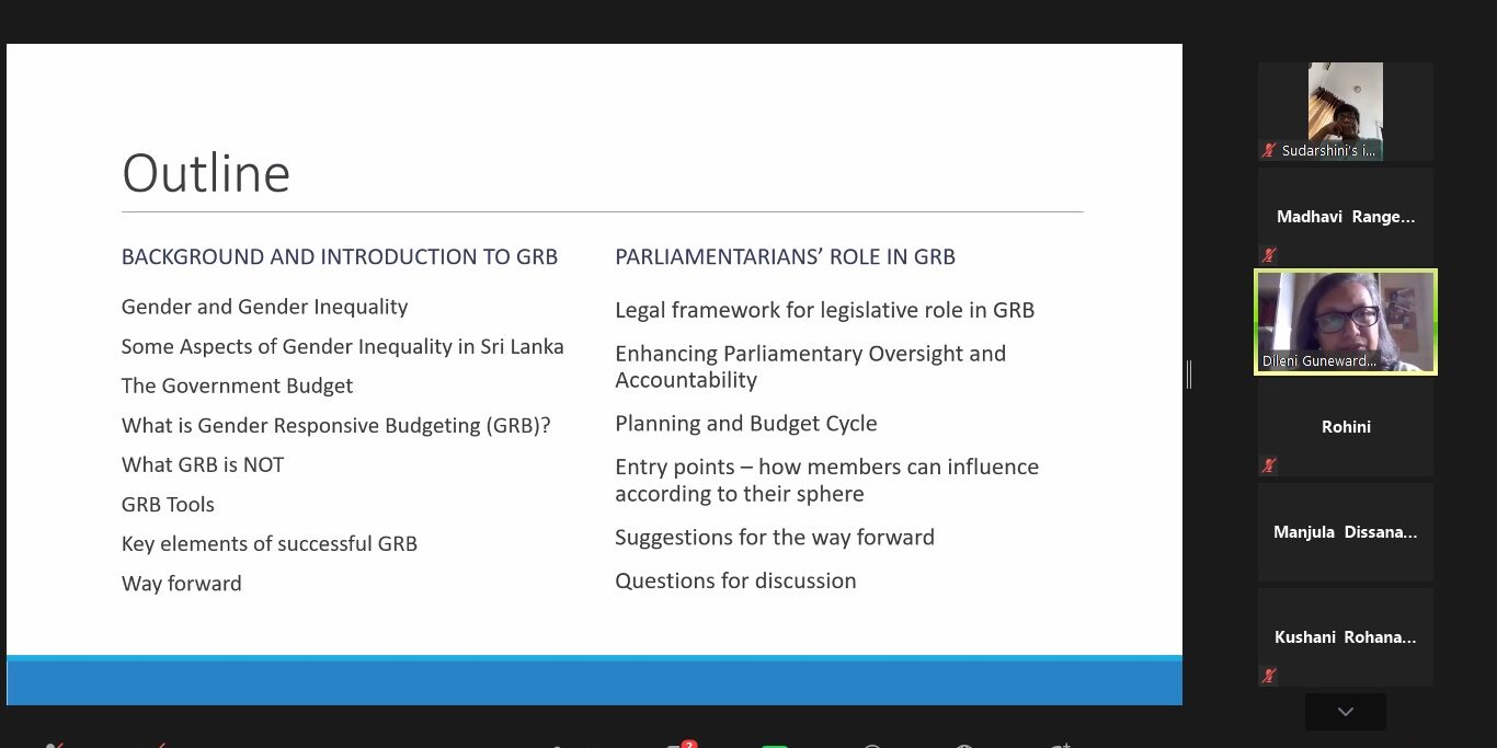 මාර්ගගත ක්රමයට සූම් තාක්ෂණය ඔස්සේ පැවති මෙම රැස්වීමට පාර්ලිමේන්තු මන්ත්රීවරියන්ගේ සංසදයේ උප සභාපතිනී රෝහිණි කවිරත්න, එහි සාමාජිකාවන් වන ආචාර්ය හරිනි අමරසූරිය, රාජිකා වික්රමසිංහ,මන්ජුලා දිසානායක,ගීතා කුමාරසිංහ සහ ඇතුළු සමාජ සංවිධාන කිහිපයක නියෝජිතයන්ද සහභාගී වූ අතර පේරාදෙණිය විශ්ව විද්යාලයේ ආර්ථික විද්යා හා සංඛ්යාන අධ්යයන අංශයේ මහාචාර්ය දිලනි ගුණවර්ධන සහ ආචාර්ය සමන්මාලා දොරබැවිල විසින් ස්ත්රී පුරුෂ සමාජභාවීය අයවැයකරණයේ පසුබිම සහ අවශ්යතාවය පිළිබඳ විශේෂ දේශන ඉදිරිපත් කරන ලදී.