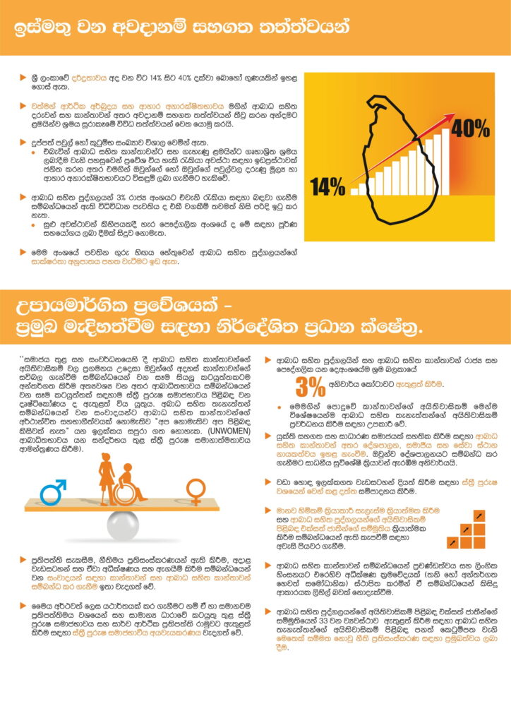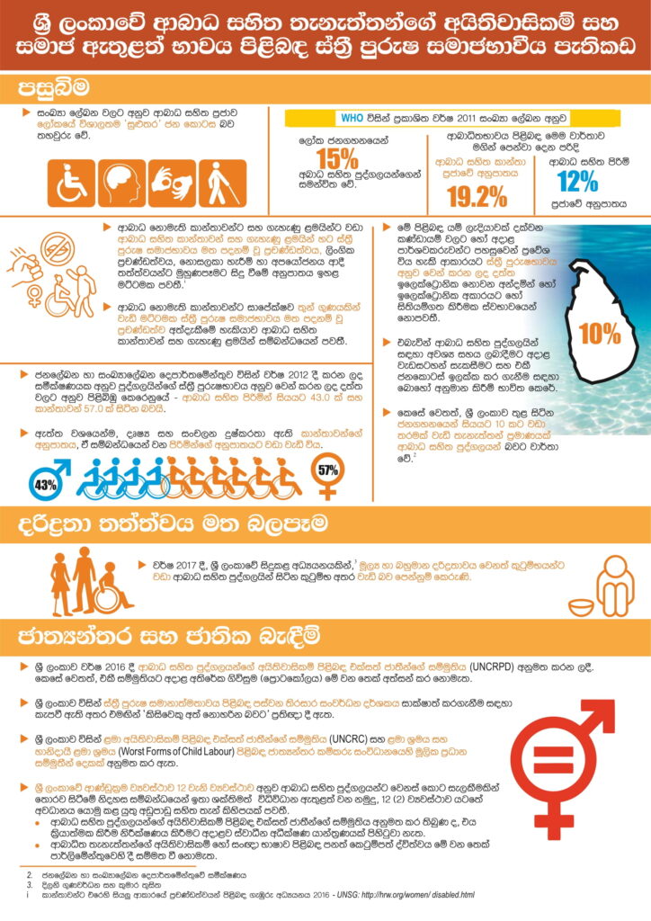ජනලේඛන හා සංඛ්යාලේඛන දෙපාර්තමේන්තුව විසින් කරන ලද අධ්යයනයකට අනුව 2012 වර්ෂයේදී ශ්රී ලංකාවේ ආබාධ සහිත තැනැත්තන්ගේ සංඛ්යාව 1,617,924 කි. මෙම සමීක්ෂණය තවදුරටත් ආබාධ සහිත තැනැත්තන් ස්ත්රී පුරුෂ සමාජභාවයට අනුකූලව බෙදා වෙන් කරයි: එය 43% පිරිමින් සහ 57% කාන්තාවන් වේ. ඇත්ත වශයෙන්ම, පෙනීම සහ එහා මෙහා යාම යන දෙකටම අදාළ දුෂ්කරතා ඇති කාන්තාවන්ගේ අනුපාතය පිරිමින්ට වඩා වැඩි විය. පාර්ලිමේන්තු කාන්තා සංසඳයේ සභාපතිනිය වන ගරු. වෙද්ය සුදර්ශිනී ප්රනාන්දුපුල්ලේ මහත්මිය පැවසූයේ ‘ආබාධිත තැනැත්තන්ගේ සංවර්ධනය සඳහා අවශ්ය වන සහයෝගය සහ සම්පත් බලමුලූ ගැන්විය යුතු ප්රමාණය සහ එහි වැදගත්කම ප්රතිපත්ති සම්පාදකයින්ට වඩා හොඳින් අවබෝධ කර ගැනීමට හැකි වන පරිදි ආබාධ සහිත තැනැත්තන්ගේ ජාතික සංඛ්යාලේඛන (විශේෂයෙන්ම රැකියා සහ ස්ත්රී පුරුෂ සමාජභාවය මත පදනම් කරගත් ප්රචණ්ඩත්වය වැනි කේෂ්ත්ර වල), යාවත්කාලීන කිරීමට පියවර ගැනීම ඉතා වැදගත් වන බවයි ”. ඇය තවදුරටත් සඳහන් කළේ ‘මේ සම්බන්ධයෙන්, වඩා හොඳ ඉලක්කගත මැදිහත්වීම් සඳහා බෙදා වෙන් කළ දත්ත සම්පාදනය කිරීම සහ පවත්වා ගෙන යාම වැදගත් වන බවයි ” .