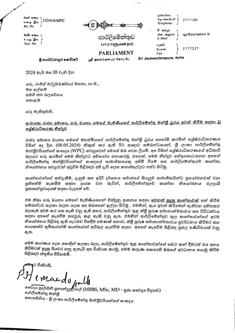 இராஜாங்க அமைச்சர் டயானா கமகே அவர்களின் பாராளுமன்ற உறுப்பினர் பதவி இரத்துச் செய்யப்பட்டதன் காரணமாக ஏற்பட்ட வெற்றிடத்துக்குப் பொருத்தமான பெண் ஒருவரை நியமிக்குமாறு கோரி பெண் பாராளுமன்ற உறுப்பினர்கள் ஒன்றியத்தின் தலைவர் கௌரவ (வைத்தியகலாநிதி) சுதர்ஷினி பெர்னாந்துபுள்ளே, ஐக்கிய மக்கள் சக்தியின் பொதுச் செயலாளர் பாராளுமன்ற உறுப்பினர் கௌரவ ரஞ்சித் மத்துமபண்டாரவுக்கு கடிதமொன்றை அனுப்பியுள்ளார்.
