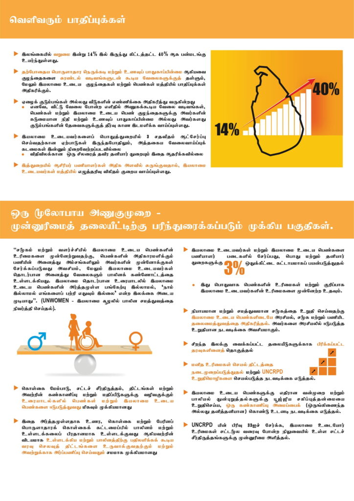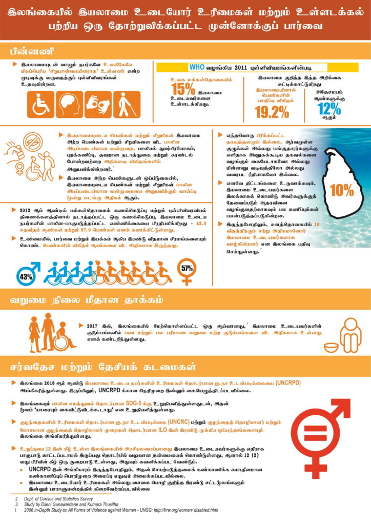 மக்கள்தொகைக் கணக்கெடுப்பு மற்றும் புள்ளிவிவரவியல் திணைக்களத்தினால் நடாத்தப்பட்ட ஆய்வின்படி, 2012 ஆம் ஆண்டில் இலங்கையில் இயலாமையுடையோர் எண்ணிக்கை 1,617,924 ஆகக் காணப்பட்டது. இந்தக் கணக்கெடுப்பானது மேலும் இயலாமையுடைய நபர்களின் பாலின-பாகுபடுத்தப்பட்ட எண்ணிக்கையைப் பிரதிபலிக்கின்றது: 43 % ஆண்கள் மற்றும் 57 % பெண்கள் எனக் கணக்கிட்டுள்ளது. உண்மையில், பார்வை மற்றும் இயக்கம் ஆகிய இரண்டிலும் சிரமங்களைக் கொண்ட பெண்களின் விகிதம் ஆண்களை விட அதிகமாக இருந்தது. “இயலாமை உடையவர்களை உள்ளடக்கிய மேம்பாட்டிற்குத் தேவையான ஆதரவு மற்றும் வளங்கள் திரட்டலின் அளவு மற்றும் ஈர்ப்புத் தன்மையைக் கொள்கை வகுப்பாளர்கள் நன்கு புரிந்துகொள்ள, இயலாமையுடையவர்களின் தேசிய புள்ளிவிவரங்களை புதுப்பிக்க நடவடிக்கை எடுக்க வேண்டியது அவசியம். குறிப்பாக, வேலைவாய்ப்பு மற்றும் பாலின அடிப்படையிலான வன்முறை போன்ற பகுதிகளில் அவசியமானதாகும்”, என பாராளுமன்ற பெண் உறுப்பினர்களின் ஒன்றியத்தின் (WPC) தலைவி. டாக்டர் சுதர்ஷினி பெர்னாண்டோபுள்ளே தெரிவித்தார். “இது சம்பந்தமாக, சிறந்த இலக்குவைக்கப்பட்ட தலையீடுகளுக்காக பிரிக்கப்பட்ட தரவை தொகுத்து பராமரிப்பது முக்கியம்” என அவர் மேலும் தெரிவித்தார்,