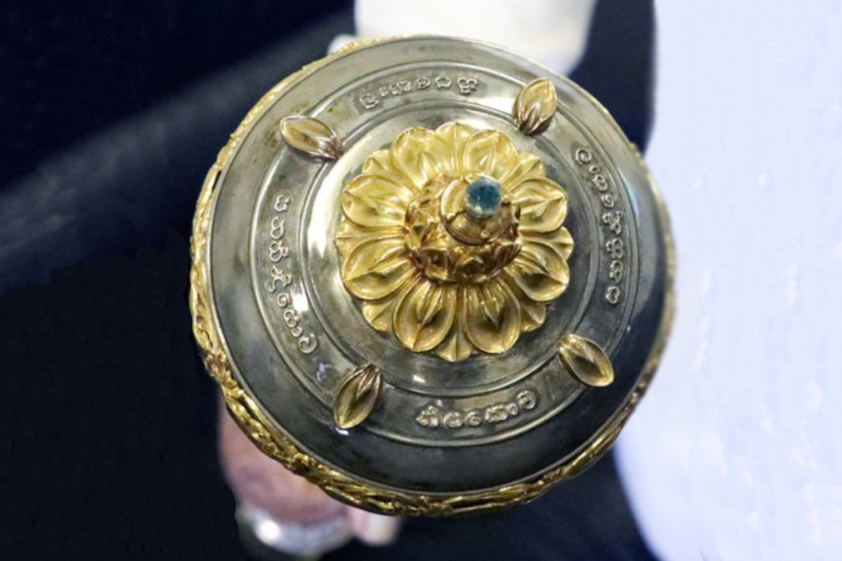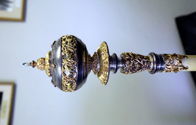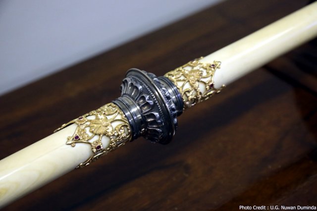 “சந்திந்திரியோச நிபகோச” என்ற பாளி வாசகம் செங்கோலின் உச்சியில் பொறிக்கப்பட்டுள்ளது.